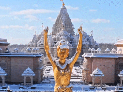बर्फ से ढका न्यू जर्सी का अक्षरधाम मंदिर: सुनहरी नीलकंठ वर्णी प्रतिमा के ऊपर फैली सफेद चादर, देखें बर्फबारी की शानदार PHOTOS