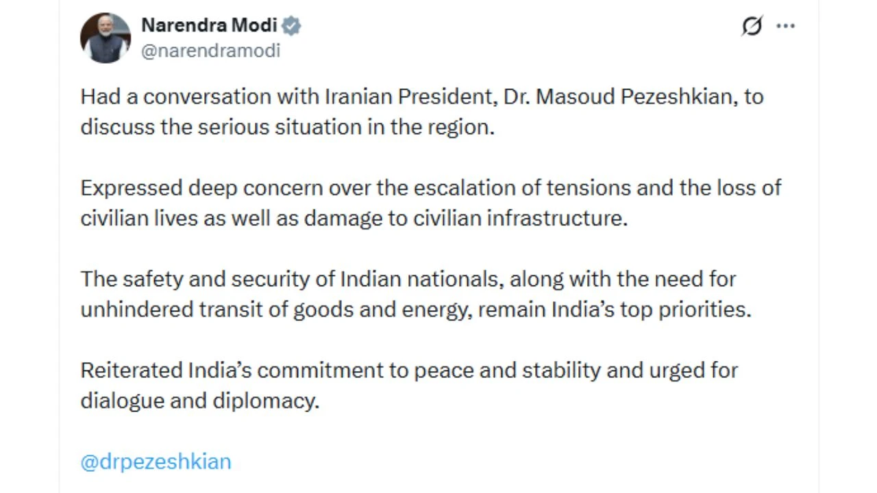 मध्य पूर्व में लगातार गहराते संकट और बढ़ते सैन्य तनाव के बीच प्रधानमंत्री नरेंद्र मोदी ने ईरान के राष्ट्रपति डॉ. मसूद पेजेश्कियान से फोन पर बातचीत की. उच्चस्तरीय चर्चा के दौरान पीएम मोदी ने निर्दोष नागरिकों की मौत और ईरान के बुनियादी ढांचे को हुए नुकसान पर चिंता जताई और शांति के लिए ‘संवाद और कूटनीति’ का रास्ता अपनाने की पुरजोर अपील की.
